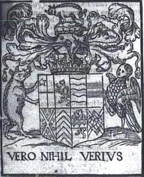 1574 woodcut showing the heraldic achievement of Edward de Vere, 17th Earl of Oxford, with Latin canting motto Vero Nihil Verius ("Nothing more true than truth")
