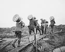 The flooded country round Nieuport meant heavy work for the divisional RE, involving maintenance of floating bridges, dams and telephone lines that were frequently broken by shellfire: 428th and 429th Fd Cos each had more than 30 bridges in their charge. 427th Field Co had the job of managing infantry working parties repairing 'Bath Dam' (Dam 66), which controlled the flow of the River Yser. The field companies also built concrete machine gun posts and observation posts, and constructed an Aerial ropeway across the river. On 19 November the division was relieved, and it made a five-day overland march to the La Bassée sector.[20][21][47][48]