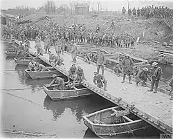 42nd (EL) Division went back into the line on 9 October, at Briastre on the River Selle, along which the retreating Germans had made a stand. Over following days the Germans made desperate attempts to destroy the bridgeheads taken over and extended by the East Lancashires. On the nights of 17 and 18 October 427th Fd Co erected four footbridges over the river, made from German telegraph poles. Then on 19 October, the night before the attack, they built four more footbridges and two Pontoon bridges under machine gun fire and gas shelling, but only suffered six casualties. The pontoon wagons had moved up with muffled wheels to maintain secrecy. The division crossed and then attacked at 02.00 on 20 October (the Battle of the Selle), securing all its objectives and consolidating against counter-attacks. The sappers then set to work repairing demolished railway bridges. Before the battle and during the subsequent advance, 428th Fd Co concentrated on developing water supplies, 429th Fd Co on road repair, and the Signal Company on laying cable from wagons.[20][21][59][60][61]