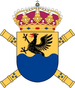 The coat of arms of the Eastern Army Division used from 1994 to 2000. Blazon: "Or, from a wavy base azure, a demigriffon issuant sable, armed and langued gules. The shield surmounted two batons, charged with open crowns azure in saltire or".[9]