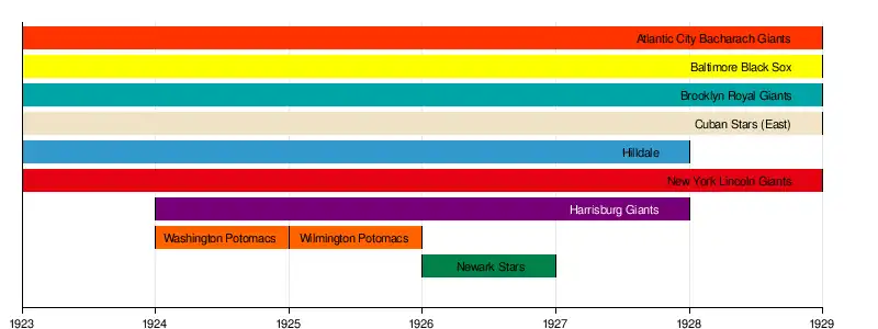 - 1928: Dropped Harrisburg Giants; Added Homestead Grays. The league broke up midway through the season due to the breakdown of the founder (and manager of Hilldale) although the individual teams continued to play.