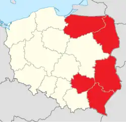 Eastern Poland (Polish: Polska Wschodnia) is a macroregion in Poland comprising the Lublin, Subcarpathian, Podlaskie, Świętokrzyskie, and Warmian-Masurian voivodeships.