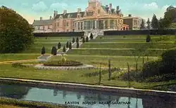 Sir Henry Cholmeley bought the manor in 1592; his direct descendant Sir Montague Cholmeley rebuilt the village in the early 19th century. Easton Hall (52°49'46.04"N 0°37'29.34"W) was built by Sir Henry Cholmeley, partly rebuilt in 1805, and enlarged in the Victorian period. It was damaged while used by the army during the Second World War and pulled down, other than the entrance hall, in 1951. The 12 acres of gardens were abandoned in 1951, but a major renovation project began in 2001,[2] under the Cholmeley family, who still live in the village. As of 2024, the gardens attract 20,000 visitors a year.[3][4]