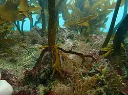Typically the species can be found on algae at low tide,[2] and underneath intertidal rocks,[5] and often lives on kelp species such as Ecklonia radiata.[9]