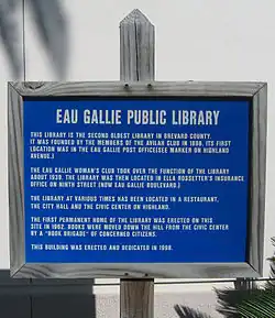 1. ^ a b c d e Eau Gallie Public Library Historical marker located at the left side of the Eau Gallie Public Library.