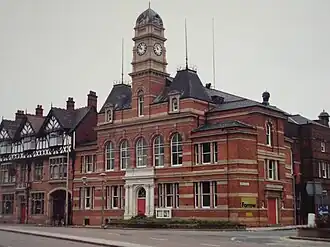 The new building was designed by John Lowe in the Edwardian Baroque style, built in red brick by Moore and Sons and was officially opened on 3 November 1881.[4][5] The building became the headquarters of Eccles Metropolitan Borough when it was formed in 1892.[6][7] The design involved a symmetrical main frontage with seven bays facing onto the Church Street; the central section of five bays, which slightly projected forward, featured a doorway with a fanlight on the ground floor flanked by two pairs of Corinthian order stone pilasters supporting a stone entablature with the inscription "Town Hall"; there were five round headed windows forming an arcade on the first floor, and at roof level there was a central clock tower with a cupola (containing a Thwaites & Reed chiming clock),[8] flanked by dormer windows with mansard roofs above. Initially, the principal room was the assembly hall;[4] the building was extended to the rear to create a new council chamber and courtroom in 1899.[4]