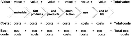 The EVR combines eco-cost and value to see whether a product will be successful. The product should have low environmental impact in its lifecycle (low eco-costs) and an attractive value for consumers. The value here is the market value (perceived customer value, also called fair price). Figure 2 depicts the three dimensions of a product: the value, the costs and the eco-costs.
