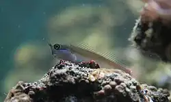 Ecsenius melarchus, known commonly as the yellow-eyed comb-tooth or the Java combtooth-blenny in Indonesia, is a species of combtooth blenny in the genus Ecsenius. It is found in coral reefs in the western Pacific ocean. It can reach a maximum length of 5 centimetres. Blennies in this species primarily feed off of plants, including benthic algae and weeds, and are commercial aquarium fish.[2] The specific name "melarchus" is Latin for "black anus", and refers to the black anal marking on the blennies in this species.[3]
