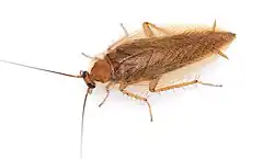The species can be easily distinguished by the dark longitudinal stripes that only occur in the German cockroach.