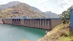 Idamalayar Dam is a multipurpose concrete gravity dam located at Ennakkal between Ayyampuzha and Bhoothathankettu in Ernakulam district of Kerala on the Idamalayar, a tributary of the Periyar River in Kerala, South India. The dam however extends east as far as Malakkappara. Completed in 1985, with a length of 373 metres (1,224 ft) and a height of 102.8 metres (337 ft), the dam created a multipurpose reservoir covering 28.3 km2 (10.9 sq mi) in the scenic hills of the Anamalais.[1][2]