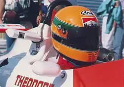 Irvine made his Formula One debut in the penultimate race of the season, the Japanese Grand Prix, partnering Rubens Barrichello at the Jordan Grand Prix team. He made an immediate impact, not only by scoring a point with sixth place, but by unlapping himself against race leader, and subsequent winner, Ayrton Senna. After the race, Senna, angry at what he perceived to be "unprofessional" driving, approached Irvine in the Jordan hospitality unit, and following an altercation, threw a punch at Irvine, for which he received a suspended two-race ban.[11] Irvine retired from the final race in Australia with accident damage.[12] After two races, Irvine finished 22nd in the Drivers' Championship with his sole point.[13]