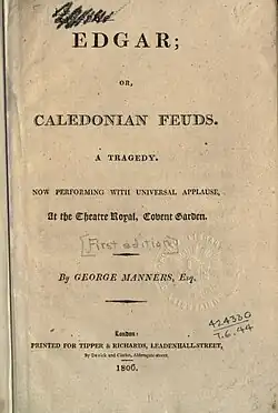 Edgar; Or, Caledonian Feuds is an 1806 historical tragedy by the British writer George Manners. I was inspired by Ann Radcliffe's novel The Castles of Athlin and Dunbayne.[1] It premiered at the Theatre Royal, Covent Garden in London on 9 May 1806. The original cast included Sarah Smith as Edgar, Henry Erskine Johnston as Osbert, Alexander Pope as Baron, William Chapman as Malcolm, William Claremont as Count Zulmio, Charles Klanert as Officer, Nannette Johnston as Matilda and Louisa Brunton as Emma. The Irish premiere took place at the Crow Street Theatre in Dublin on 30 April 1808.[2]