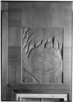 Bry married in 1921. Her husband, Maurice Shevelson Benjamin (1896–1984), was an engineer and founder of a brokerage firm called Benjamin, Hill & Company.[37][55] They remained married to each other for the rest of their lives. Their only child, Bry Benjamin, was born in 1924 and died in 2009. [note 10] In 1929 the family moved to a large apartment on an upper floor in the newly opened Beresford building on Central Park West. The apartment had been designed for them in Art Deco style by a well-known architect, Ely Jacques Kahn. Bry carved the wood panel that was set over the fireplace in the library.[37][7] The panel can be seen in the photo at right and in the portrait of Bry and her husband at top. Edith Bry died at home in New York on January 19, 1991.[37]
