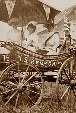 In 1913, the Brooklyn carriage company, I.S. Remson, donated an old wagon called the “Spirit of 1776” to the New York State Woman Suffrage Association. State suffrage association president Harriet May Mills assigned the vehicle to Edna Buckman Kearns for use in Long Island suffrage organizing. The wagon's presentation ceremony was held in July 1913, an event that was covered by the city's newspapers, including the New York Times.[10] Kearns held leadership roles in Nassau and Suffolk County suffrage clubs. She became a suffrage columnist and editor for the Brooklyn Daily Eagle starting about 1911 and served the suffrage movement in many capacities, including writer, editor, and press contact for local, state, and national campaigns. She wrote under the bylines Edna Buckman Kearns or Mrs. W.R. Kearns.[11]