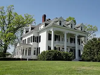 Ednam House is a historic home located near Ednam, Albemarle County, Virginia. It was designed by Richmond architect D. Wiley Anderson in Colonial Revival style. It was built about 1905, and is a two-story, wood-frame structure sheathed in weatherboards and set on a low, brick foundation. The main block is covered by a steep deck-on-hip roof, with tall, brick, pilastered chimneys with corbeled caps projecting from the roof on each elevation. Attached to the main block are a series of rear ells covered by low-hipped roofs. The front facade features an original colossal two-story portico consisting of four unfluted Ionic order columns.[3]