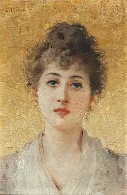 Among his work are The cabin of Nelson and Donna con Ventaglio (Girl with Fan)[3] He also painted orientalist subjects and portraits, including those exhibited at 1897 at London, Portrait of Lady Hastings Campbell (Flora Mure-Campbell, Marchioness of Hastings?) and in 1906 at Paris (Princess Alexandria of Yugoslavia).[4]