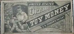 Although toy money first appeared in Germany in the middle of the 19th century, Milton Bradley pioneered the use of toy money in the United States.[2] Educational Toy Money was first printed in 1877, and various editions also appeared using the titles Bradley's Toy Money, and Toy Money. It rapidly became an educational tool valued by schools. In an 1889 issue of The School Journal, W.R. Prentice, a school superintendent in Hornellsville, New York (now Hornell, NY), mentioned Bradley's Toy Money as an essential tool in teaching children to count.[3] An 1891 editorial in the Journal of Education warned against using educational toys that were "fads", and added, "Not all new and fashionable devices are fads. Bradley's Toy Money is new and fashionable, but it is not a fad. It should be classed with the classics because it partakes of the elements that have made some devices classic."[4]