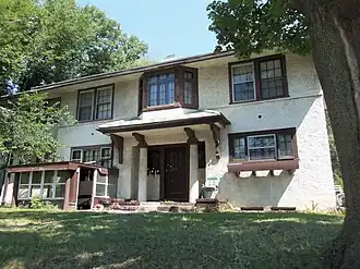 The Roberts house appears to be one of the styles that the Gordon-Van Tine Company offered in its catalog. The two-story side porch version was offered in the 1918 Gordon-Van Tine Ready Cut homes catalog, but the house was first offered -- with only a single-story side porch-- in their 1916 Ready Cut homes catalog, which also showed the house on its cover. [3][4] The house is not a pure example of any architectural style. However, it is one of the few examples of a strong influence of the Prairie School-style found in Davenport.[2] Its symmetry and the prominent entry reflect the influence of the Georgian/Federal Revival, which was very popular in the city. The Prairie School influence is found in its horizontality, which is realized in the low hipped roof, wide eaves, and its windows that are grouped in bands. The stylized columns in antis of the entry combines the Neoclassical with an arrangement that is found on a number of early Prairie School houses by Frank Lloyd Wright and his followers in Oak Park, Illinois and Mason City, Iowa.[2]