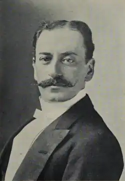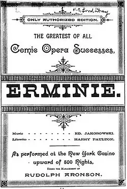 Jakobowski's most successful work by far, Erminie, opened in 1885 in London. It was revived extensively and toured internationally,[4] playing with extraordinary success on Broadway from 1886.[5] None of his other works had more than a short run or two, although many of them toured profitably.[3] For two Victorian burlesques, The Three Beggars (1883) and Little Carmen (1884), Jakobowski used the pen name Edward Belville. His principal shows were Dick (1884, based on the story of Dick Whittington; libretto: Alfred Murray), Erminie (1885), The Palace of Pearl (1886), Mynheer Jan (1887; libretto: Harry Paulton), Paola (1889; libretto: Paulton), La Rosiére (1893, in one act), The Queen of Brilliants (1894; libretto: Brandon Thomas, starring Lillian Russell), The Devil's Deputy (1894; libretto: J. Cheever Goodwin), Milord Sir Smith (1898, originally titled Cumpano; libretto O'Day and Adrian Ross),[6] Tarantella (1899; libretto: Alfred Murray)[7] and Winsome Winnie (1903). He was one of eight composers who contributed to Pat in 1892.[8] Two short operettas in 1893 with libretti by B. C. Stephenson, The Improvisatore and A Venetian Singer, made little impact.[9]