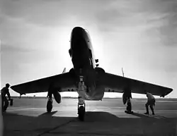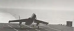Feightner was assigned as the Navy's project pilot for the Vought F7U Cutlass, a carrier-based jet fighter-bomber with swept wings and an unusual tailless design.[47] From July 23 to August 14, 1951, he performed carrier suitability tests of the Cutlass on board the USS Midway.[48] Feightner survived a number of near-fatal incidents in the Cutlass. During a test using the NAS Patuxent River air field catapult, an engine exploded and caught fire on takeoff. Unable to eject at such a low altitude, Feightner made use of a low spot in the river bank to turn the aircraft and return safely to the field where firefighters extinguished the burning engine.[49] On July 23, 1951, he performed the first (and only) carrier takeoff and landing of the dash-1 variant on the aircraft carrier USS Midway.[47] Landing the Cutlass was hazardous due to the extreme nose-up attitude that restricted visibility forward and below. Feightner was unable to see the flight deck and relied on the Landing Signal Officer (LSO) to provide the indication to reduce engine power. Despite assistance from the LSO, Feightner landed short of the desired position and nearly struck the ramp.[50] Although the fleet received the improved F7U-3, the Cutlass did not live up to its potential and remained in service less than four years.[51]