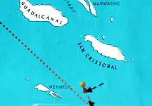 After several weeks of repair, Enterprise sortied to oppose an Imperial Japanese battle fleet that was threatening the Solomon Islands.[16] The Japanese convoy included eleven transports with over seven thousand soldiers headed down the "Slot" to Guadalcanal to retake Henderson Field.[17] On November 14, 1942, Feightner protected U.S. dive bombers and strafed enemy vessels during the strikes that destroyed seven of the troop carriers—a significant event in the Naval Battle of Guadalcanal.[17][18] After the attacks, VF-10 remained at Henderson Field on Guadalcanal to reinforce the 1st Marine Division and deal with the Japanese ships and troops from the remaining transports that had intentionally beached themselves.[19][20] Conditions on the island were primitive and dangerous for pilots of the Cactus Air Force. Many of the servicemen came down with malaria. Japanese soldiers hid in trees and waited to ambush the Americans. Sleep was disrupted by night bombardment.[21] Fortunately, Feightner had to endure the hazardous conditions on Guadalcanal less than a week, as VF-10 left their old aircraft at Henderson Field and returned to Enterprise on November 25, 1942, where they received new F4Fs.[22][23]