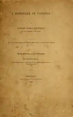 - ^ Edward Maria Wingfield's "Discourse" shows how much he and the native American werowances [chiefs] tried to co-exist peacefully when the settlers first arrived: "June the 25th [1607]. An Indian came to us from the great Powhatan with the word of peace, that he desired greatly; that the werowances Paspahegh & Tapahanagh, should be our friends and that we should sow and reap in peace."