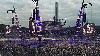 × was nominated for Album of the Year at the 57th Grammy Awards.[100] Sheeran performed "Thinking Out Loud" alongside John Mayer, Questlove and Herbie Hancock at the ceremony.[101] On 25 February, Sheeran won British Male Solo Artist and British Album of the Year for × at the 2015 Brit Awards.[102] On 21 May he received the Ivor Novello Award for Songwriter of the Year.[103] On 21 June, Sheeran co-hosted the 2015 Much Music Video Awards in Toronto, where he performed the singles "Thinking Out Loud" and "Photograph"; he also won two awards, Best International Artist and Most Buzzworthy International Artist or Group.[104][105] On 27 June, Sheeran performed as the opening act for The Rolling Stones in their Zip Code Tour date in Kansas City's Arrowhead Stadium.[106] On 10–12 July 2015, Sheeran performed sold-out shows at London's Wembley Stadium. The shows, which were announced in November 2014, were part of his world tour.[107] The concert was documented and aired on 16 August 2015 on NBC; the one-hour special Ed Sheeran – Live at Wembley Stadium also included behind-the-scenes footage.[108] In November 2015 Sheeran released the DVD Jumpers for Goalposts: Live at Wembley Stadium; the title is a nod to playing concerts at Wembley Stadium, the home of English football.[109]