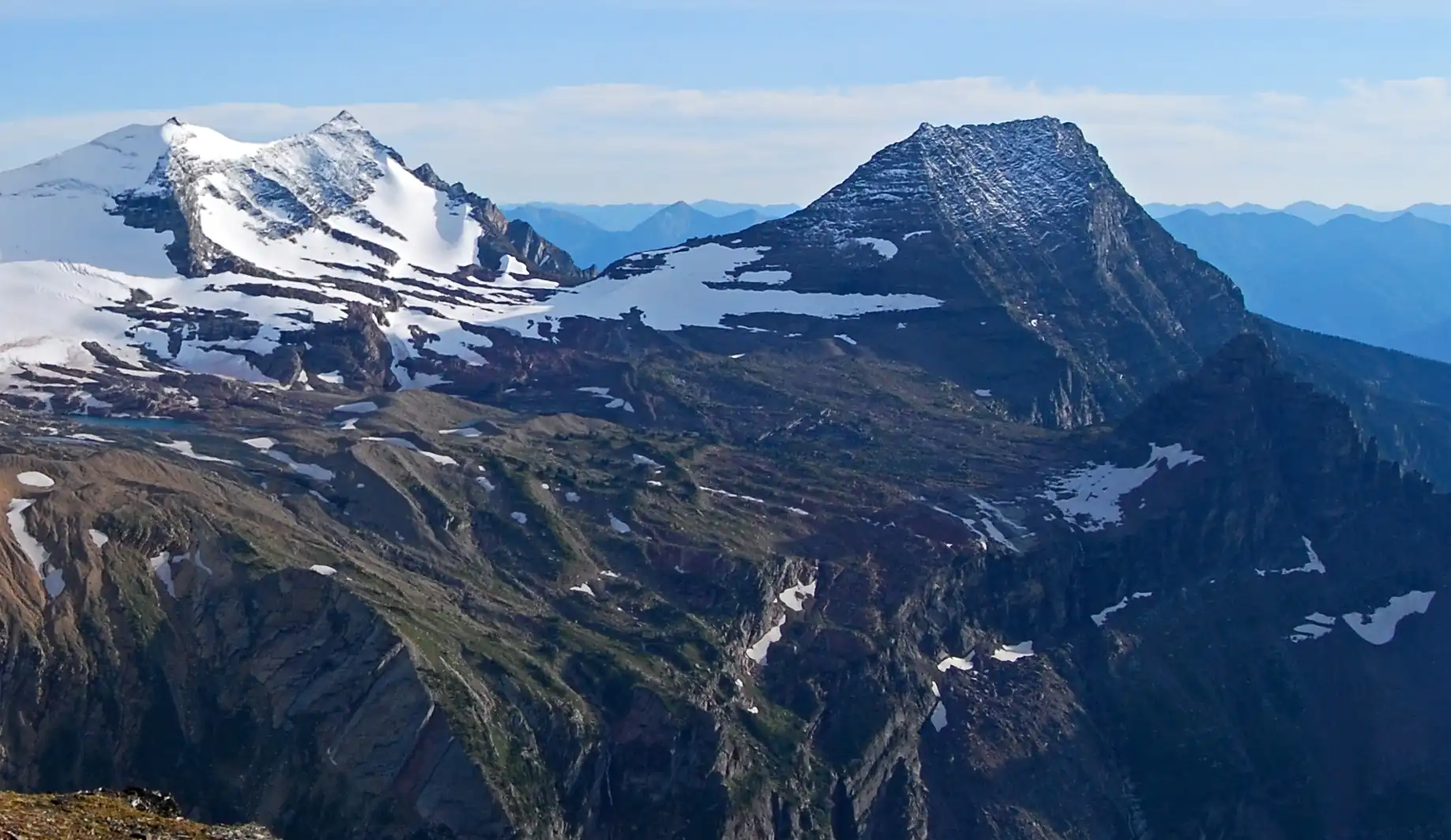 Gunsight Mountain (left), Edwards Mountain, and Little Matterhorn (lower right) seen from Bearhat Mountain