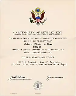 After returning to the United States, Doss was appointed as senior Air Force advisor to the Pennsylvania Air National Guard.[30] His next assignment was as vice commander of the 85th Air Defense Division at Andrews Air Force Base. He then served as deputy commander of the Washington Air Defense Sector at Fort Lee, Virginia until 1960, when he was appointed commander of the Bangor Air Defense Sector.[31] While serving as commander of the Bangor Air Defense Sector, he held the position of commander of the Bangor North American Air Defense Sector.[32]