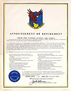 After the Korean War, Doss held assignments including senior Air Force advisor to the Pennsylvania Air National Guard, Vice Commander of the 85th Air Division (Air Defense) at Andrews Air Force Base, and Deputy Commander of the Washington Air Defense Sector at Fort Lee, Virginia.[7] In 1963, Doss was assigned to the United States Air Forces in Europe (USAFE) headquarters as Deputy Inspector General and Inspector General.[8] In 1964, he was appointed as head of the command liaison agency to the government of France at Paris.[9] He retired from the Air Force in 1968. He died in 1996 at age 81 in Riverside, California, and was buried at the Riverside National Cemetery.[10]