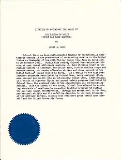 Edwin A. Doss (September 14, 1914 – January 7, 1996)[1] was an American fighter pilot and commander in the U.S. Air Force during World War II and Korean War. Logging more than 4,500 flying hours, Doss flew 573 combat hours and accrued 280 combat missions during his leadership in the South West Pacific Theatre and Korean War.[2][3] For his two-year service as commander of the 35th Fighter Group during World War II, Doss was awarded the Distinguished Flying Cross, Legion of Merit, and the Air Medal.[4][5] He received his second Legion of Merit and the Korean Ulchi medal with a Silver Star for his assignments as commander of the 49th Fighter Bomber Wing and the 3rd Bomber Wing at Kunsan, Korea. Colonel Doss's service has been cited as integral to the development of long-range fighter tactics in the South West Pacific Theater.[6]