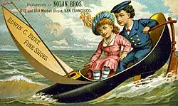 In 1838, Burt began to produce boots and shoes with his father in Hartford. The business moved to New York City in 1848 as the market in Hartford was too small. At this time Burt's brother, James, began working with him. The firm was officially founded in 1860, and primarily dealt with markets in the Southern United States. When the Civil War began in 1861, this business was effectively gone. Subsequently, the company began producing women's and children's shoes.[1] In 1874, Burt patented an improvement he made to shoes. The patent described a new method of producing shoes that provides increased durability. The patent number was 146801 and was filed November 24, 1873.[2] Burt's shoe company was especially known for its advertisements. A series of trade cards were produced in the 1880s for the company advertising their shoes. One such trade card featured children sitting in an oversized shoe, shaped like a sailboat, with the caption "Edwin C. Burt, Fine Shoes".[3] The trade cards also came with a warning to customers to check for stamps in his shoes, to ensure that they were genuine products.[4] On August 10, 1898, the company assigned its liabilities over to a Thomas Cunningham of Blauvelt, New York, estimated at $60,000.[5]
