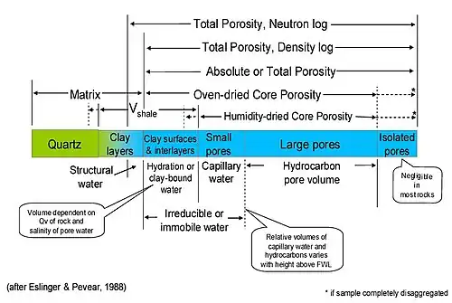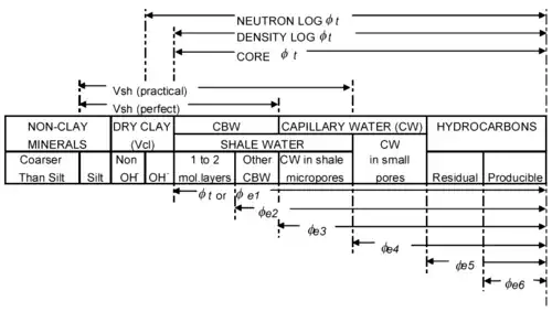 "Small pores” contain capillary water which is different from CBW in that it is physically (not electrochemically) bound to the rock (by capillary forces). Capillary water generally forms part of the effective pore space for both log and core analysis. However, microporous pore space associated with shales (where water is held by capillary forces and hence is not true CBW) is usually estimated as part of the Vsh by logs and therefore not included as part of the effective porosity. The total water associated with shales is more properly termed “shale water” which is larger in value than CBW.[8] If we humidity dried core samples, (some of) the electrochemically bound CBW would be retained, but none of the capillary-bound microporous water (notwithstanding comments in [7]). Therefore, although the figure infers that a humidity-dried core could produce an effective porosity similar to a log analysis effective porosity, the effective porosity from the core will usually be higher (see “Examples” section)—notwithstanding comments in.[2] Traditionally, true CBW has been directly measured neither on cores nor by logs, although NMR measurement holds promise.[9]