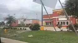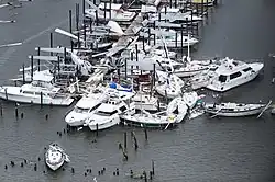 Making landfall as a Category 4 hurricane, Harvey inflicted tremendous damage across Aransas County.[23] Wind gusts were observed up to 132 mph (212 km/h) near Port Aransas.[24] Nearly every structure in Port Aransas was damaged, some severely, while significant damage from storm surge also occurred.[23] In Rockport, entire blocks were destroyed by the hurricane's violent eyewall winds. The city's courthouse was severely damaged when a cargo trailer was hurled into it, coming to a stop halfway through the structure. The gymnasium of the Rockport-Fulton High School lost multiple walls while the school itself suffered considerable damage.[23] Many homes, apartment buildings, and businesses sustained major structural damage from the intense winds, and several were completely destroyed. Numerous boats were damaged or sunk at a marina in town, airplanes and structures were destroyed at the Aransas County Airport, and a Fairfield Inn in the city was severely damaged as well.[25] About 20 percent of Rockport's population was displaced, and they were still unable to return to their homes a year after the hurricane.[26] One person died in a house fire in the city, unable to be rescued due to the extreme weather conditions.[27] Just north of Rockport, many structures were also severely damaged in the nearby town of Fulton. In the small community of Holiday Beach, catastrophic damage occurred as almost every home in town was severely damaged or destroyed by storm surge and violent winds. By the afternoon of August 26, more than 20 in (510 mm) of rain had fallen in the Corpus Christi metropolitan area.[9] All of Victoria was left without water and most had no power.[23]
