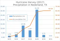 Many locations in the Houston metropolitan area observed at least 30 in (760 mm) of precipitation,[28] with a maximum of 60.58 in (1,539 mm) in Nederland.[29] This makes Harvey the wettest tropical cyclone on record for both Texas and the United States,[30] surpassing the previous rainfall record held by Tropical Storm Amelia.[31] The local National Weather Service office in Houston observed all-time record daily rainfall accumulations on both August 26 and 27, measured at 14.4 and 16.08 in (366 and 408 mm) respectively.[32] Due to the amount of rain accumulated from Harvey, the National Weather Service added 2 new colors to the rain index representing around 50% of the maximum rainfall dropped by Harvey. Multiple flash flood emergencies were issued in the Houston area by the National Weather Service beginning the night of August 26. In Pearland, a suburb south of Houston, a report was made of 9.92 in (252 mm) of rainfall in 90 minutes.[33] The 39.11 in (993 mm) of rain in August made the month the wettest ever recorded in Houston since record keeping began in 1892, more than doubling the previous record of 19.21 in (488 mm) in June 2001.[34] The 32.47 inches (825 mm) of rain from August 26–28 set a United States record for highest 3-day rainfall at a major city.[35] The storm surge peaked at 6 feet at Port Lavaca,[36][37] reducing outflow of rainwater from land to sea.[38]