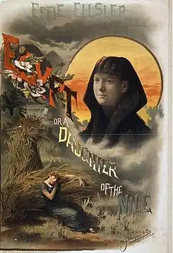 On November 26, 1884, in New York, Ellsler opened as Priscilla Sefton at the Union Square Theatre in the American debut of Robert W. Buchanan's Storm Beaten and at the same venue two months later appeared as Mabel Blair in the premier production of Bartley Campbell's Separation.[4] By late 1885 journalist Marcus Klaw had signed Ellsler to star in a national tour of the Frank Harver play, Woman Against Woman,[5] a drama that tells the story of Bessie Barton and her sacrifice that saved the reputation of an ungrateful sister.[6] With A. L. Erlanger as the company's advance man Woman Against Woman with Ellsler toured successfully for three seasons.[2][3][7] Over the following decades plays of note that Ellsler starred in, either in New York or on the road, would include Camille from the novel by Alexandre Dumas, fils, Clinton Stuart's The Keepsake, Judge Not by Frank Hervey, Laura Don's Egypt: or a Daughter of the Nile and as Julia Marlowe's replacement in Barbara Frietchie by Clyde Fitch.