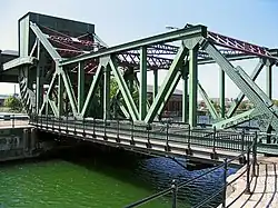 Egerton Bridge is situated between Egerton Dock and Morpeth Dock and is a working example of a bascule bridge. It was built between 1928 and 1931, as one of four similar bascule bridges in the Merseyside docks, replacing an earlier swing bridge. The bridge and the machine house were completely restored in 1993 and opened to the public in 1995.[7]
