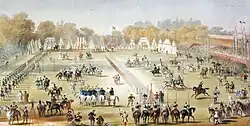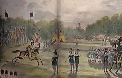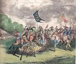 The dress rehearsals were held in London at a garden behind the Eyre Arms, St John's Wood,[24] a tavern close to Regent's Park,[25] the last one on Saturday 13 July 1839. Nineteen knights participated. The audience was invitation only; many of "the very elite of the most elite" (said the "Court Journal") were invited to watch, and 2,690 attended. The rehearsal went perfectly. The weather was sunny, the banners and armour and tents impressive, the jousting successful. Even critics conceded that the tournament was likely to be a fine show.[26]