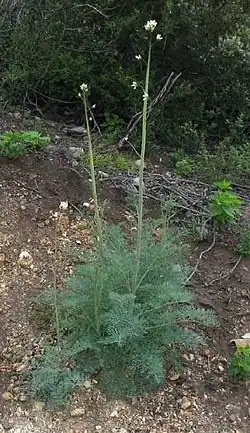 Stems and leaves are glaucous. Stems grow 1–2 m (3.3–6.6 ft) tall; the record is 4 m (13 ft), the tallest of any species in the Fumarioideae. Leaves are pinnately divided 2–4 times. They grow in a basal rosette the first year and later also on flowering stems.