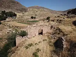 In 1870, Victor Guérin described the ruins there: "The ruin is close to the 'Ain el Samieh. This spring flows under a chamber with circular vaulting and built of large blocks : near it lie several fragments of columns in stone and capitals imitating the Doric style. To the north and above the spring I remarked the ruins of a considerable building, intended perhaps to protect it, and constructed of gigantic blocks rudely hewn. On the lower slopes of the mountain a great many grottoes have been cut in the rock".[28] He also noted that the fields were cultivated with lentils, beans and wheat by the fellahin from Kafr Malik. At the time of sowing and harvesting, several of the caves at Ein Samiya served as temporary refuge for these families.[29]