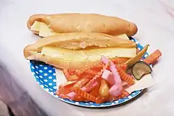 Eish fino (Egyptian Arabic: عيش فينو) is a long baguette-shaped bread roll from Egypt made with wheat flour. It is the most commonly consumed bread type in the country after eish baladi, the staple flatbread.[1] It has a soft texture and is often cut open to allow for fillings, common ones include various cheeses, halawa or fried cow liver. The loaves are thin and long, usually around 20 centimeters in length. The width on the other hand can vary greatly, but bakeries rarely make them wider than a few centimeters.