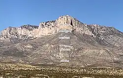 El Capitan (Spanish: El Capitán) is a peak in Culberson County, Texas, located within Guadalupe Mountains National Park.[2] The 7th-highest peak in Texas at 8,085 ft (2,464 m), El Capitan is part of the Guadalupe Mountains, an exposed portion of a Permian period reef uplifted and exposed by tectonic activity during the late Cretaceous period.[3] The southern terminus of the Guadalupe Mountains, El Capitan looms over U.S. 62/180, where its imposing height and stark outline have made it one of the iconic images of the Trans-Pecos to generations of travelers.