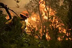 On September 17 the El Dorado Fire crossed State Route 38 and grew to 21,678 acres (8,773 ha) by the next day.[30] While U.S. Forest Service Hotshot crews conducted controlled burns near Angelus Oaks on September 17, wind gusts created local fires that resulted in the death of a firefighter.[31][32] On September 18 residents of Forest Falls and Mountain Home Village were allowed to return to their homes.[30][33] By September 24, the fire had grown to 22,604 acres (9,148 ha), but was estimated to be 81 percent contained and the evacuation order for Angelus Oaks was lifted.[34][35][36] Containment reached 93 percent on September 28,[37] and it continued to burn until November 16.[38]