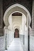 The palatial complex contained multiple residences, pavilions, and gardens, as well as other amenities like a mosque and a hammam (bathhouse).[3] The main residences were in the form of courtyard buildings with a fountain or water basin at their center.[2]: 137–144 [10]: 108 [9] During the Zayyanid period, there were four main palaces: Dar al-Malik (Arabic: دار الملك), Dar Abu Fahr (Arabic: دار ابي فهر), Dar al-Surur (Arabic: دار السرور), and Dar al-Raha (Arabic: دار الراحة).[3] Three of these were built by Abu Tashfin I (r. 1318–1337).[2]: 137–144 [10]: 108 Some of the palaces were adapted to serve for different seasons. The summer residence was built with mudbrick which kept the temperature cool, while the winter residence was made of stone which kept it warm during the cold months.[3] Inside the summer residence was a secret passage to the adjacent mosque, which was used by the ruler during prayer time to move between the mosque and the palace while remaining unseen by the public. The passage could accommodate horses.[3] The walls of the palace were decorated and rich decoration including zellij (tile mosaic) and carved stucco.[2]: 137–144 Among the decorative motifs were Islamic calligraphy, including one sentence repeatedly inscribed which read "The splendor of God...the king that is in God" ("العزُّ القائم بالله.. الملك القائم بالله").[3] One of the palaces studied by modern archeologists featured a central alcove at the back of its large audience hall, an element that had precedents in earlier Zirid and Fatimid palaces but distinguished it from contemporary palace architecture in other regions.[2]: 146