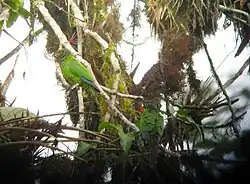 The IUCN originally assessed the El Oro parakeet as Vulneralble but since 2000 has listed it as Endangered. It has a very limited range and an estimated population of fewer than 1000 mature individuals. "Remaining habitat is fragmented, and both range and population are thought to be declining."[1] The Buenaventura Reserve was created in 1999 by Fundación de Conservación Jocotoco to conserve this species and the El Oro tapaculo (Scytalopus robbinsi). It encompasses about 4,000 ha (15 sq mi) of cloudforest in which the Fundación maintains a network of nest boxes.[8] About 75% of the El Oro parakeet's population is found there and nearby.[1]