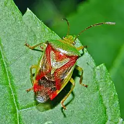 Elasmostethus interstinctus, the birch shield bug,[2] is species of shield bug in the Acanthosomatidae family. Shield bugs are often called "stink bugs" because they excrete a foul smelling liquid that is used to deter predators.