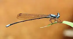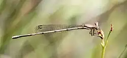 This is a smallish damselfly (wingspan of 40 mm (1.6 in)) which exhibits strong sexual dimorphism. Males have a pale blue thorax with a black lateral stripe. The long, slender abdomen is black, with a while underside, and a pale blue tip. There is a white ring at each joint. The eyes are turquoise.[3][4]