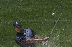 Woods practicing in a bunker prior to the start of the 2014 Quicken Loans National