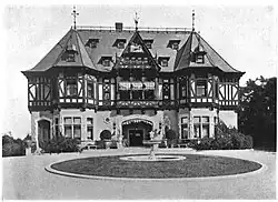 In 1892, Mortimer and his wife Eleanor were included in Ward McAllister's "Four Hundred", purported to be an index of New York's best families, published in The New York Times.[11][12] Conveniently, 400 was the number of people that could fit into Mrs. Astor's ballroom.[13][14] Mortimer, a member of the Tuxedo Club, Metropolitan Club, Knickerbocker Club, Union Club, City Club, Racquet Club, Coaching Club, Riding Club and Westminster Kennel Club, wore a cravat that covered his throat with "a diamond stickpin so big that his friends called him "Flashlight Dick."[15] Along with the Lorillards, the Mortimers were one of the founding families of Tuxedo Park, New York.[16][17] Their home in Tuxedo was known as Mortemar,[18] a "turreted four-story mansion."[19] Mortemar was designed by Richard Howland Hunt of Hunt & Hunt. Construction began in the 1890s and continued for 10 years.[20]