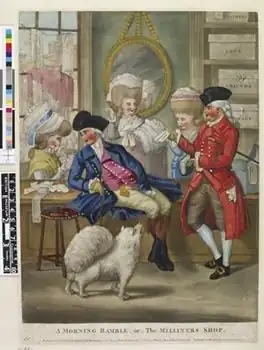 In 1747, The London Tradesman (a guide to the trades) gave a list of a milliner's responsibilities: "The Milliner is concerned in making and providing the Ladies with Linen of all sorts, fit for Wearing Apparel, from the Holland Smock to the Tippet...the Milliner furnishes them with Holland, Cambrickm Lawn and Lace of all sorts and makes these Materials into Smocks, Aprons, Tippers, Handkerchiefs, Neckties, Ruffles, Mobs, Caps. The make up Cloaks, Manteels, Mantelets, Cheens and Capucheens of Silk, Velvet, plain or brocaded and trim them with Silver and Gold Lace or Black Lace. They make up and sell Hats, Hoods, and Caps of all Sorts and Materials; they find them in Gloves, Muffs and Ribbons: they sell Petticoats and Hoops of all Sizes."[16] In the seventeenth century, milliners were predominantly men but a change in fashionable dress for women led to milliners being mostly women. The mantua, an open-front gown with a loose-fitting unboned bodice cut all in one piece with the skirt, much like an overrobe became popular. The gown was worn over a corset and petticoat and the skirts of the gown were draped up to reveal the petticoat. The mantua started as an informal at-home gown but evolved into a more formal style that became acceptable at court.[17] The gap in the front of the bodice was filled in with a stomacher which were often covered with lace, ribbons, and various other trimmings. Previously, most women's clothing had been made by tailors but this new style was easier to make and seamstresses moved into making mantuas. Before this seamstresses mostly made simple items such as shirts, chemises, cuffs, and collars. Even as the style of the mantua became more complicated and went out of style, women continued to make all sorts of clothing for women and the term mantuamaker became synonymous with dressmaker.